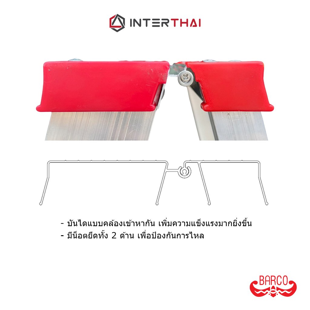 BARCO LITE บันไดอลูมิเนียม ขึ้นทางเดียว 8 ขั้น 2.00 เมตร บันไดอเนกประสงค์ แบรนด์ BARCO ที่ 1 ด้านบันไดอลูมิเนียม คุณสมบัติเฉพาะ: - ผลิตจากวัสดุอลูมิเนียม 6063 แข็งแรงทนทาน - น้ำหนักเบา เคลื่อนย้ายสะดวก แม้ไม่มีผู้ช่วย - สามารถขึ้นลงได้ทางเดียว - ขั้นบันไดเป็นกล่องมีแกนกลาง ไม่หักงอ ใช้งานได้นานยิ่งขึ้น - ขั้นบันไดมีลายเส้นกันลื่น - ขาบันไดเป็นกล่อง เพิ่มความแข็งแรงมากขิ้งขึ้น - มีเส้นเสริมตรงกลางระหว่างขั้นที่ 1-3 เพื่อกระจายการรับน้ำหนัก - มีพลาสติกปิดมุมที่บริเวณหัวบันได - ขาบันไดมียางหนาพิเศษหุ้ม ข้อมูลสินค้า - ความสูง 2.00 เมตร หรือ 200 เซนติเมตร - ความสูงระหว่างขั้นเหยียบ 25 เซนติเมตร - รับน้ำหนักได้ไม่เกิน 100 กก.