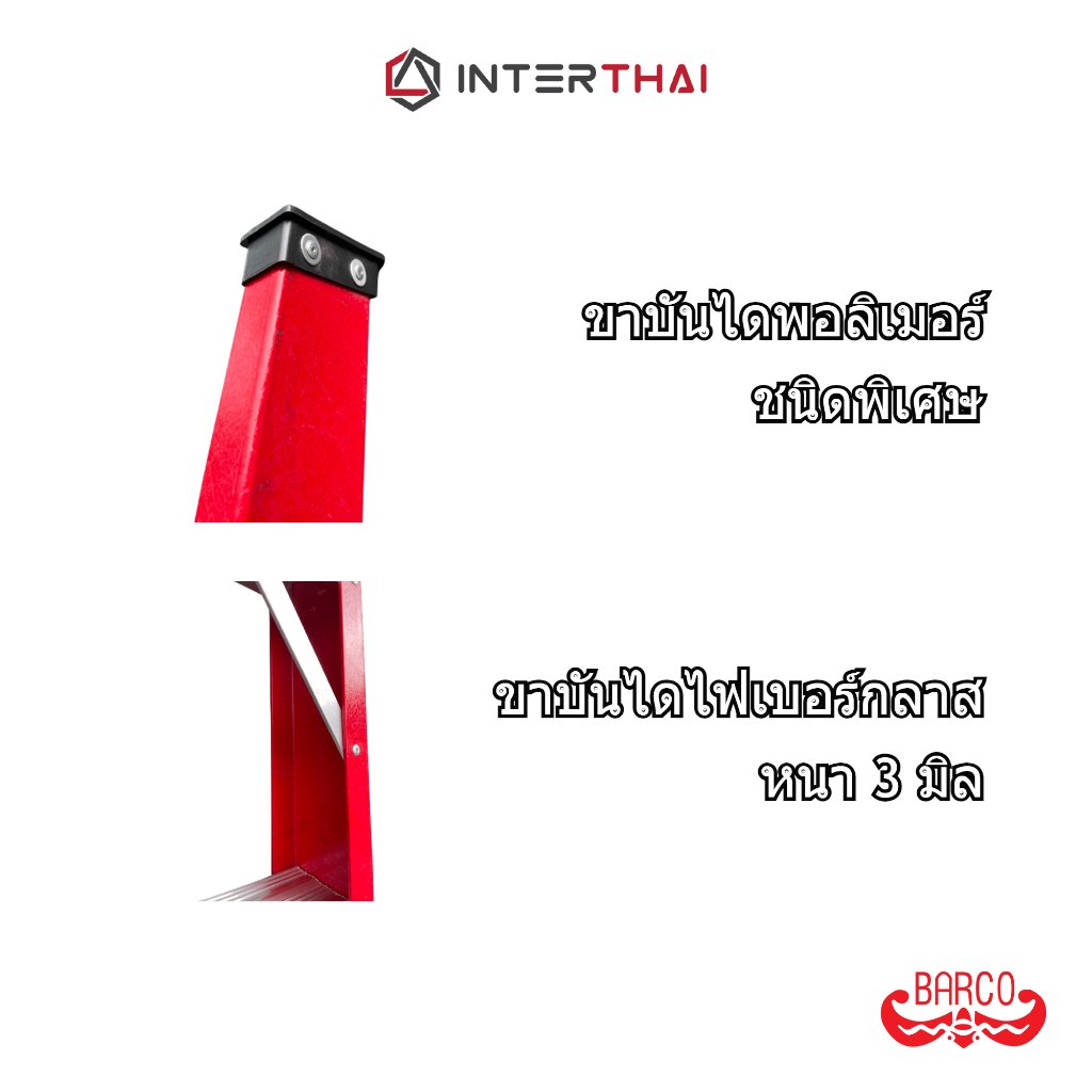 BARCO บันไดพาดไฟเบอร์กลาส มีราวจับ 8 ฟุต 240 ซม. รับได้ 150 กิโลกรัม คุณสมบัติเฉพาะ: - ขาบันไดผลิตจากไฟเบอร์กลาส หนา 3 มิล ทนทานรับน้ำหนักได้ดี - ขั้นเหยียบผลิตจาก อลูมิเนียม 6063 หนา 1.8 มิล แข็งแรงไม่ขึ้นสนิม - บันไดกว้างพิเศษ 45 ซม. เพื่อให้การปีนง่ายยิ่งขึ้น - ขายางผลิตจากพอลิเมอร์คุณภาพดี ขนาดใหญ่ขึ้นกว่าเดิม - วัสดุไฟเบอร์กลาส ป้องกันไฟดูดและ ป้องกันกรด - ขั้นเหยียบ กว้าง 76 มม. มีความโค้งมน มีร่องกันลื่น - เส้นเสริมมีขนาดกว้าง 6 หุน และ หนา 3 มม. เพื่อเสริมความแข็งแรงให้มากยิ่งขึ้น ข้อมูลสินค้า - รุ่น 8 ฟุต - ความสูงบันได 2.40 ม. - รับน้ำหนักได้ 150 กก. พิเศษ!!! ได้ส่วนลดเพิ่มเมื่อซื้อบันไดคู่กับ ราวแขวนบันได จัดส่งฟรี